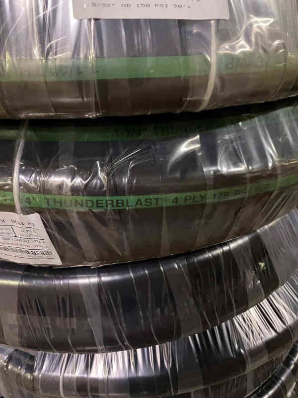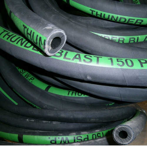 • La manguera Thunderblast® se constituye de un tubo de caucho natural conductor estático con refuerzo de alambre de acero de cuatro capas  o dos capas de alta resistencia y una cubierta de SBR resistente a la abrasión.  Disponibles en secciones de  50 y 100 ft.