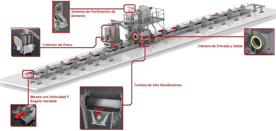 Máquina diseñada y construida por CMV para la limpieza de superficies externas en tuberías. Remueve incrustaciones, oxido, calamina y toda clase de contaminantes para generar superficies uniformes de alta calidad. Ofrece la mejor relación costo/beneficio para demandas de pequeños y grandes volúmenes de producción, es rápida, económica y de alta eficiencia energética. La tubería se traslada y rota dentro de la cámara de trabajo, gracias a los transportadores de entrada y de salida.