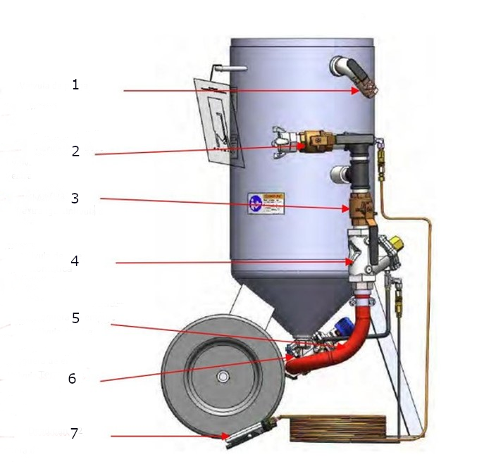 La tolva se despresuriza cuando se suelta la palanca del control remoto (deadman) permitiendo el paso de abrasivo para llenado de la tolva, incluye: