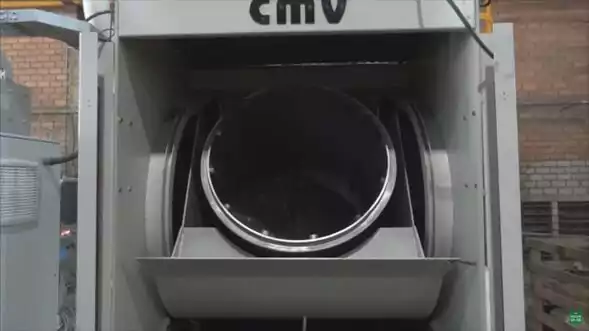 Máquina diseñada y construida por CMV ideal para el tratamiento de piezas fundidas, forjadas, estampadas, templadas, elementos de fijación y piezas automotrices. Dispone de una turbina de alto poder ubicada en la parte superior y un tambor de fondo perforado que voltea para ser llenado o vaciado, el cual se ajusta herméticamente e inicia una rotación que hace que las piezas giren y se expongan al chorro de abrasivo proporcionado por la turbina de alto eficiencia. Esta máquina es accionada y controlada desde el tablero de mandos.