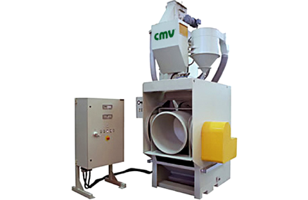 Máquina diseñada y construida por CMV ideal para el tratamiento de piezas fundidas, forjadas, estampadas, templadas, elementos de fijación y piezas automotrices. Dispone de una turbina de alto poder ubicada en la parte superior y un tambor de fondo perforado que voltea para ser llenado o vaciado, el cual se ajusta herméticamente e inicia una rotación que hace que las piezas giren y se expongan al chorro de abrasivo proporcionado por la turbina de alto eficiencia. Esta máquina es accionada y controlada desde el tablero de mandos.