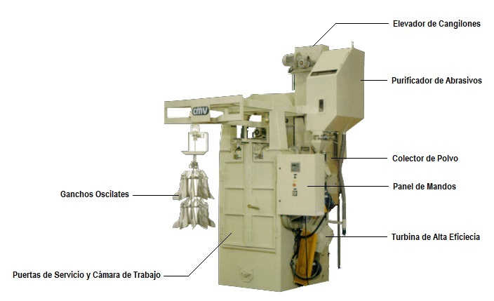 Esta máquina posee un sistema colector de abrasivo que consta de un tornillo sinfín, un elevador de cangilones, un purificador de abrasivo y un colector de polvo con sistema de limpieza de filtros automático. Por su diseño es un equipo de alto rendimiento tanto para piezas livianas y de gran tamaño. Diseñada y construida por CMV.