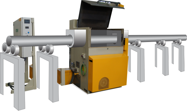 Máquina para limpieza externa de tubos de hasta de 10” de diámetro. Con sistema de limpieza por choro de abrasivo generado por turbina alta eficiencia, produce una superficie uniforme, con perfil de anclaje requerido y de costo operativo más bajo comparado con sistemas similares. Adecuada para producciones continuas y equipada con un sistema transportador de rodillos tipo bicónico (skew roll) a la entrada y salida, el cual ayuda a la tubería con los movimientos de traslación y rotación de forma simultánea.