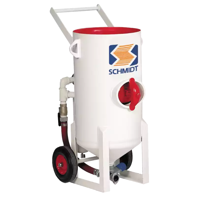 Los sistemas de limpieza de superficie portátiles SCHMIDT® son los caballos de batalla de la industria de chorro de aire abrasivo (Granallado y/o SandBlasting), diseñadas para proporcionar la caída de presión más baja de la industria – menos de 1,5 psi y en algunos casos menos de 1 psi – en comparación de 10 a 14 psi de otros sistemas en el mercado. Es importante tener en cuenta que por cada caída de 1 psi en la boquilla, hay una correspondiente pérdida de 1,5% en la productividad.