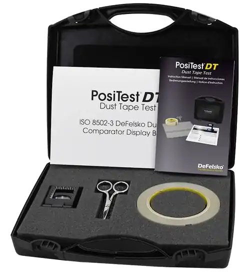 La prueba de cinta PosiTest DT por contaminación por polvo, desarrollado por DeFelsko, es un procedimiento de prueba, definido por la norma ISO 8502-3, que se utiliza para evaluar el índice de cantidad y tamaño de polvo en superficies de acero antes de la aplicación de pinturas y revestimientos. El polvo suele estar presente en las superficies de acero después de la limpieza por granallado por residuos remanentes del abrasivo y depósitos del entorno y la atmósfera.