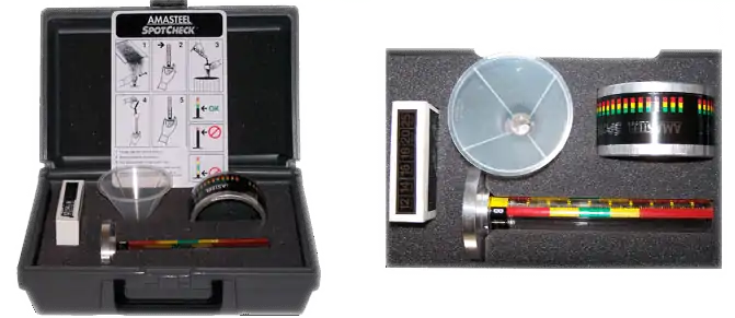 Este kit fácil de usar ayuda a determinar el «equilibrio» de la mezcla de trabajo abrasiva, cada vez que se va volviendo más delgada a lo largo de su vida útil. Nuevas adiciones de abrasivo se determinan por los resultados de las condiciones de la mezcla de trabajo y los ciclos de vida del abrasivo. Este kit le proporcionará la información necesaria para obtener los máximos beneficios de la granalla AMASTEEL y AMACAST.